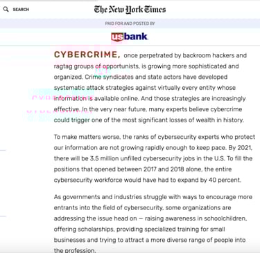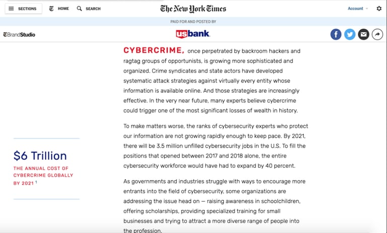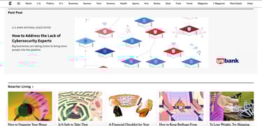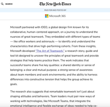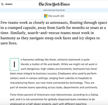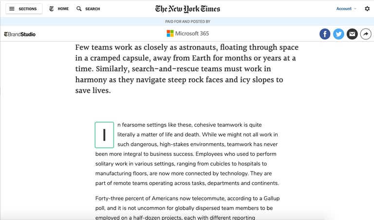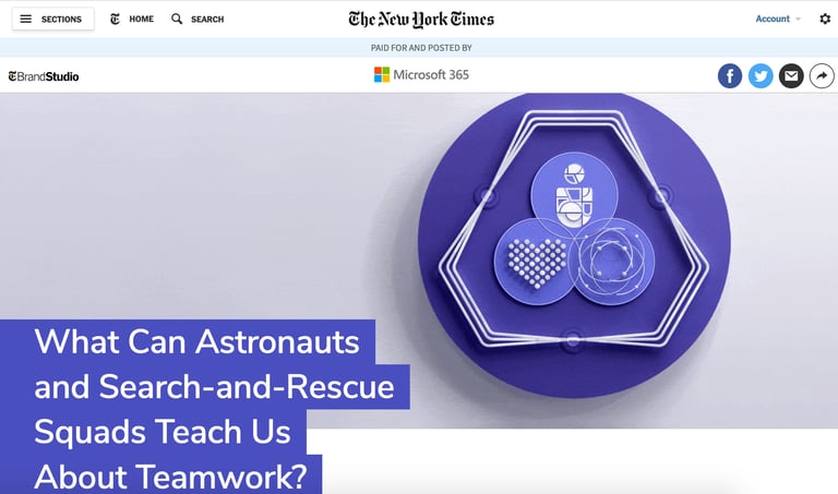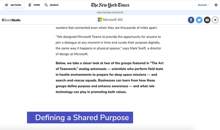 Long-form branded content feels like the perfect marriage of copywriting and journalism, using story technique to engage readers and build brand love. I've worked with the New York Times' T-Brand Studio, The Washington Post Brand Studio, The Players' Tribune, The Foundry (Meredith), Afar Media, Audubon and other content publishers, strategizing and creating digital and video executions. I worked with a wide range of clients that included Raytheon, BP, The American Association of Realtors, Hilton, the state of West Virginia, Chemours, US Bank, AT&T, the Islands of Tahiti, Microsoft, Wells Fargo, the state of Montana, and several others. Alas these executions are no longer clickable, so: screenshots. I'm happy to provide Word docs upon request, if you really want to read them.