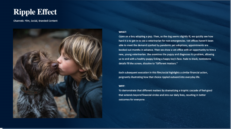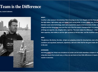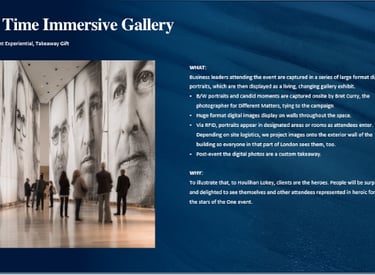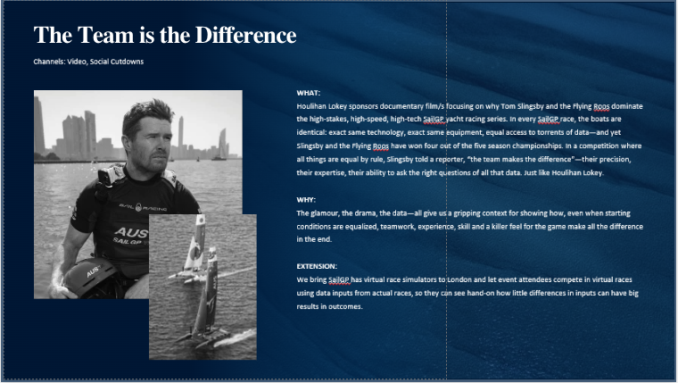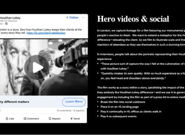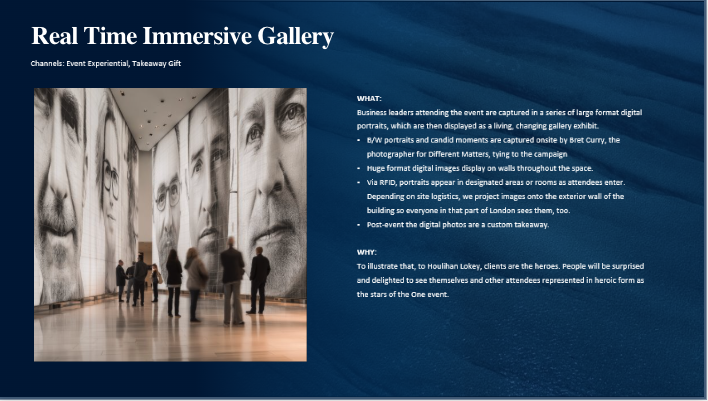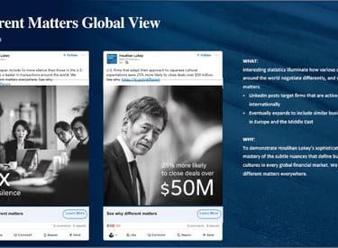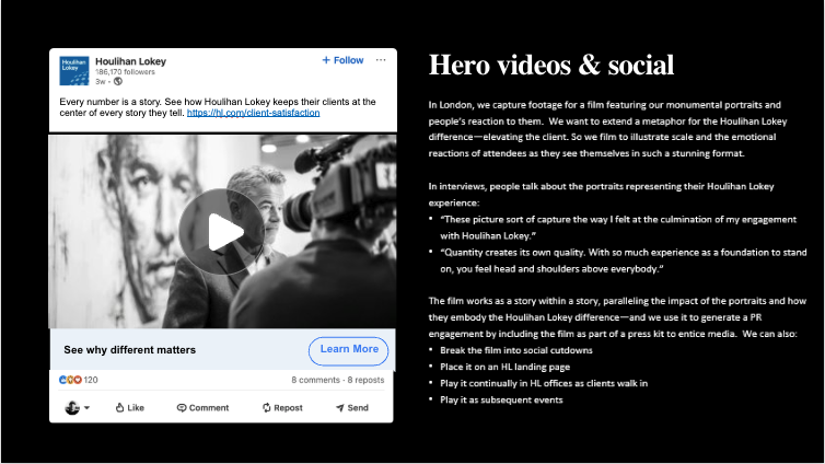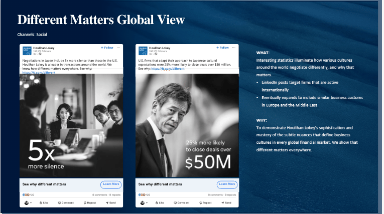Being a creative isn't as simple as coming up with the right line at the right time. It's fitting everything together, making it all make sense in a way that just hits home. I was part of the pitch team that won the Houlihan Lokey account, and part of the team that built out the work. An investment bank, Houlihan Lokey does more M&A transaction than Goldman, JPMorgan, Deutsche or any other bank in the world--but nobody knew their name. We're fixing that by centering a campaign on why they are different--their human touch, their deep expertise, their reality-based valuations. Their Net Promoter Score was off the charts for a financial institution, which means they tend to make their customers very happy with the results. The challenge, of course, is that their potential audience is small at any given moment. But we found them--at financial conferences and highly targeted ads, with geolocation and other techniques, and we made them the story. We started with a hall of heroes at the One Houlihan event in London, trying to elevate customers to heroic proportions, quite literally, with massive portraits of attendees. People would walk in and around the event and see themselves in giant portraiture . Here's that and some other ideas we had around why "different Matters" when you're dealing with Houlihan Lokey.