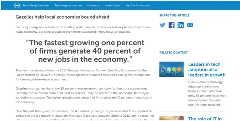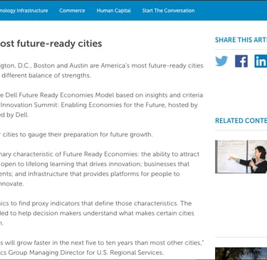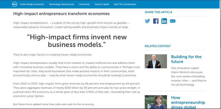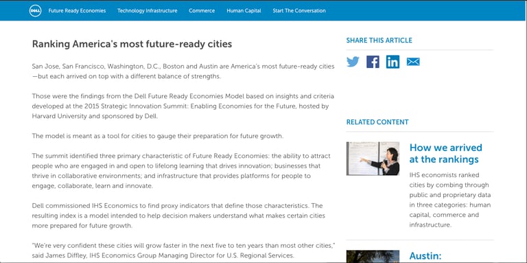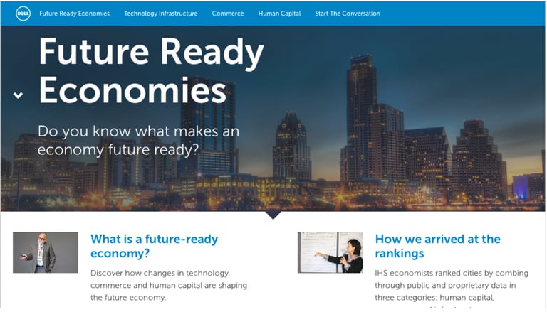 I was the lead writer on the Dell account for Young & Rubicam several years back. We came up with the "future-ready" campaign in 2015--a cliche by now, but the way we developed the campaign is noteworthy. We convened a group of experts for a round table at Harvard, where they ranked the future readiness of various cities around the country (and, in a second phase, around the world). We publicized those results and wrote stories and made videos around what makes a city future ready and what kind of businesses characterize the landscape of those cities. The earned media was phenomenal, as cities rushed to brag about where they had landed on the list. We expanded future readiness into medicine and film-making, among other sectors. The campaign provided a couple years worth of material. Because it was a while ago, these assets are no longer clickable, but you can get an idea of what we did.